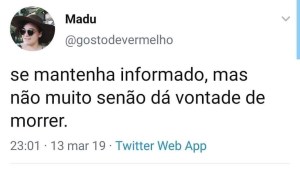 É MUITO importante se manter informada(o) nesse momento, porém não deixe o Coronavírus tomar conta de toda a informação que você recebe. Ficar acompanhando as notícias 24h por dia pode e provavelmente vai te deixar ansiosa(o) e deprimida(o). Tire um tempo para ver outros assuntos, ler outras coisas, assistir vídeos sobre outros temas.