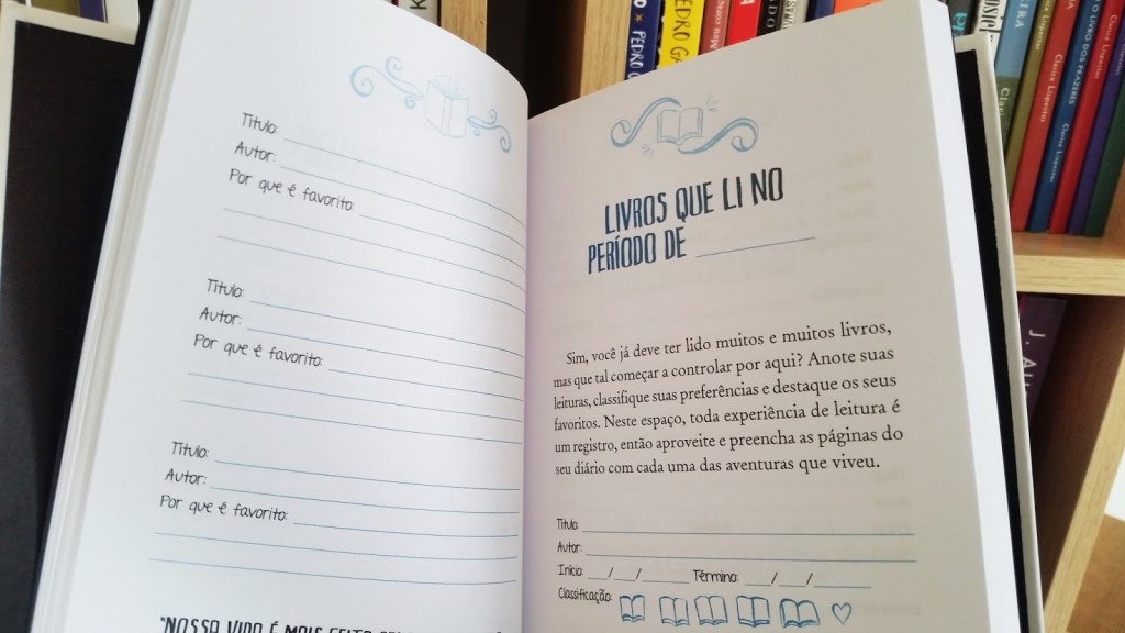 “Seu diário de aventuras literárias Esta é a sua agenda de leituras! Um lugar para anotar todos os livros que você leu, separá-los por categorias e organizar suas metas de leitura, tudo isso enquanto enfrenta desafios estimulantes e divertidos. Apresentando as mais variadas listas e propondo uma jornada literária diversificada e ousada, o Livro de marcar livros é bem mais que uma experiência interativa: é também uma timeline dos seus hábitos literários e um espaço para planejar todas as suas próximas aventuras narrativas” – Disponível na Amazon